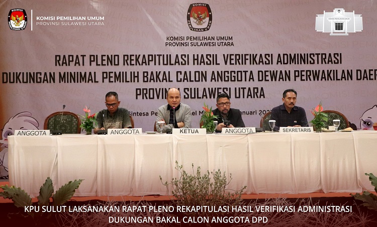 mediatotabuan.co, Sulut – Komisi Pemilihan Umum (KPU) Provisi Sulawesi Utara (Sulut), menggelar Rapat Pleno Rekapitulasi Hasil Verifikasi Administrasi Dukungan Minimal Pemilih Bakal Calon (Balon) Anggota Dewan Perwakilan Daerah (DPD) dari Daerah Pemilihan (Dapil) Provinsi Sulut, Minggu (15/01/2023).