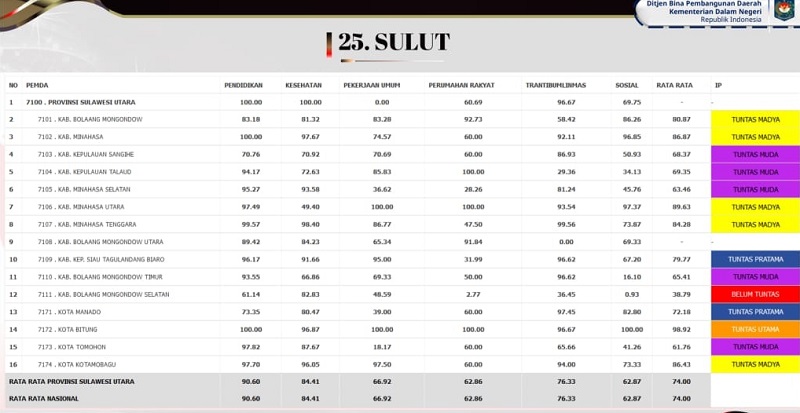 “Mulai dari Pelayanan Dasar pada Bidang Pendidikan dan Bidang Kesehatan, Bidang Pekerjaan Umum tuntas sebesar 100% atau zona hijau, Bidang Perumahan Rakyat sebesar 80%, Bidang Trantibunmas sebesar 77,78 %, dan Bidang Sosial sebesar 41,43%. Insya Allah persentasi ini akan terus naik, sehingga peringkat Kota Kotamobagu juga akan terus naik,” tuturnya.