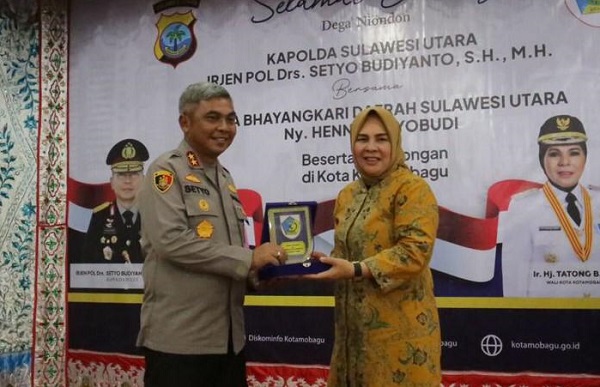 Wali Kota Kotamobagu, Ir Hj Tatong Bara, saat menyerahkan cindramata kepada Kapolda Sulut. (Foto: Diskominfo Kotamobagu)