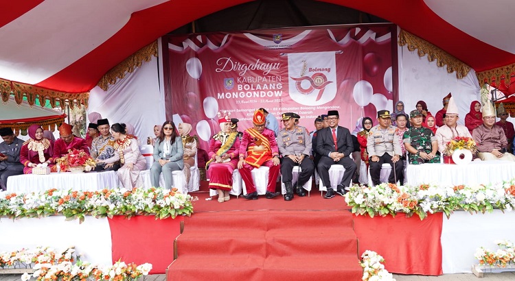 Upcara yang dihadiri para tamu dan undangan dari berbagai daerah termasuk Pemprov Sulut dan Ormas serta OKP ini kental dengan nuansa adat Kabupaten Bolmong dan bertajuk “Dengan semangat HUT ke 69 Kabupaten Bolmong, kita tingkatkan daya saing daerah menuju lumbung pangan regional kawasan timur Indonesia”.