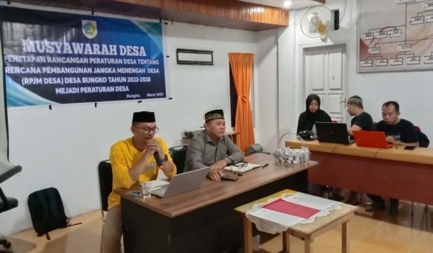 Agenda tersebut, dihadiri Ketua BPD beserta anggota, Ketua Lembaga Adat, Imam dan Pegawai Syar’i, LINMAS, Tokoh Masyarakat, Ketua Pemuda Desa Bungko serta Tim Penyusun RPJMDes Bungko.