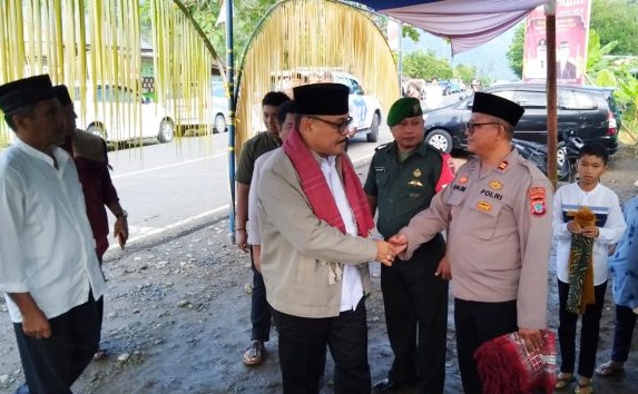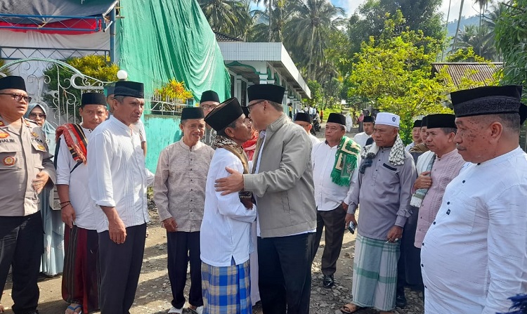 Pj Bupati Bolmong, Ir Limi Mokodompit MM, saat disambut imam dan pengurus Al-Mukminun Desa Muntoi. (Foto: Diskominfo Bolmong)