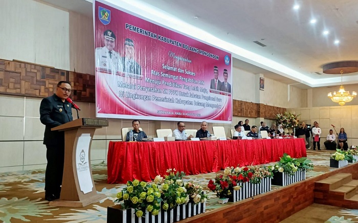 SK Pengangkatan P3K Kabupayen Bolmong Formasi Guru Tahun 2022 ini, diserahkan Pejabat (Pj) Bupati Bolmong, Ir Limi Mokodompit MM, di Hotel Sutanraja Kotamobagu.