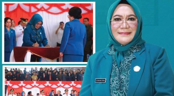 Hj Fitriana Nani Buhang, dilantik sebagai Ketua TP-PKK Kota Kotamobagu, usai pelantikan dan pengambilan sumpah jabatan kepada Pj Wali Kota Kotamobagu, Dr Drs Hi Asripan Nani MSi.