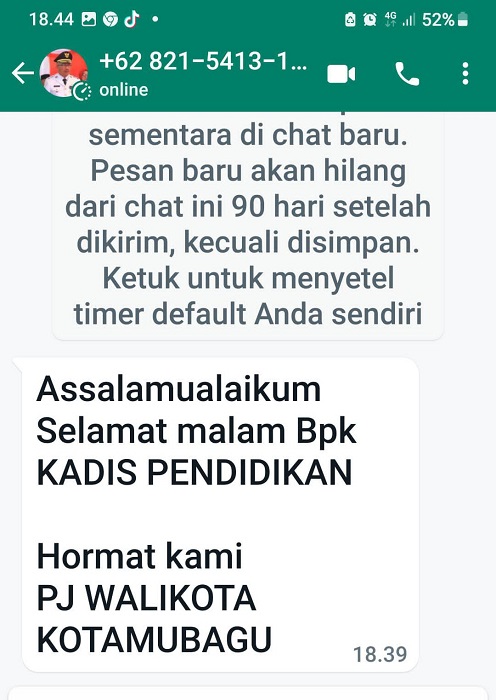 Oknum penipu yang mencatut nama Pj Wali Kota Kotamobagu ini, melancarkan aksinya via WhatsApp (WA) nomor selular 0821-5413-1118 dengan memakai foto profil Asisten II Pemerintah Provinsi (Pemprov) Sulawesi Utara (Sulut).