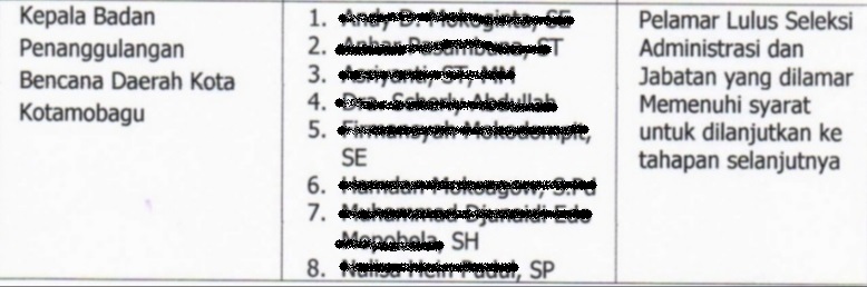 Dari hasil pengumuman Tim Panitia Seleksi, Bernomor: 05/Pansel-ST-KK/X/2023 tentang hasil seleksi administrasi JPT Pratama di lingkungan Pemkot Kotamobagu, ada delapan (8) nama yang dinyatakan lolos administrasi untuk formasi jabatan Kepala BPBD Kotamobagu
