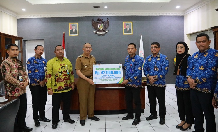 Penyerahan santunan ini, dilaksanaka di ruang kerja Wali Kota Kotamobagu, didampingi Kepala BPJS Ketenagakerjaan Sulawesi Utara, Sunardy Syahid, Selasa (17/10/2023).
