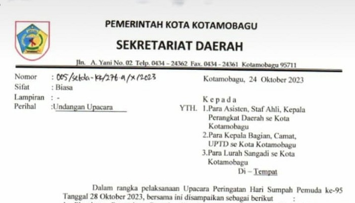 Surat perihal undangan upacara bersifat biasa tersebut, tertanggal 24 Oktober 2023, dan ditujukan kepada para asisten, staf ahli, kepada OPD se- Kota Kotamobagu, kepada bagian, camat, UPTD se-Kota Kotamobagu, serta para lurah dan sangadi de-Kota Kotamobagu.