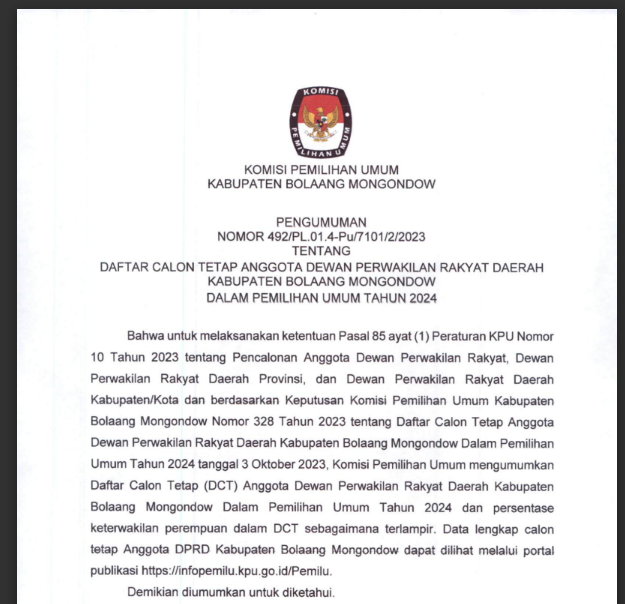 Bahwa untuk melaksanakan ketentuan Pasal 70 Peraturan KPU Nomor 10 Tahun 2023 tentang Pencalonan Anggota Dewan Perwakilan Rakyat, Dewan Perwakilan Rakyat Daerah Provinsi, dan Dewan Perwakilan Rakyat Daerah Kabupaten/Kota, KPU Kabupaten BOLAANG MONGONDOW mengumumkan Daftar Calon Tetap (DCT) Anggota DPRD Kabupaten BOLAANG MONGONDOW dan persentase keterwakilan perempuan dalam Daftar Calon Tetap (DCT) sebagaimana terlampir.***