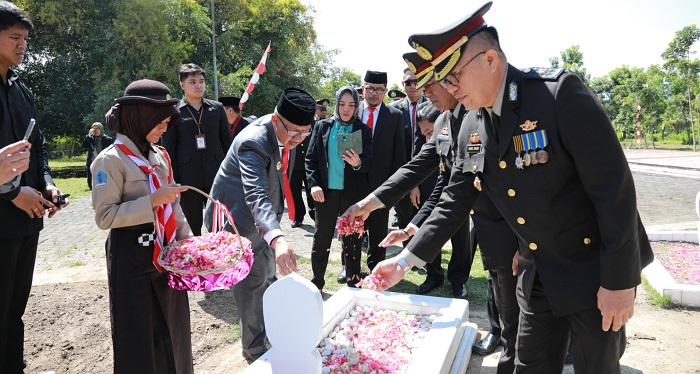 Pj Wali Kota Kotamobagu, Hi Asripan Nani dan Forkopimda Kotamobagu, saat menaburkan bungan di atas makan para pahlawan di TMP Mongkonai Barat. (Foto: Diskominfo Kotamobagu)
