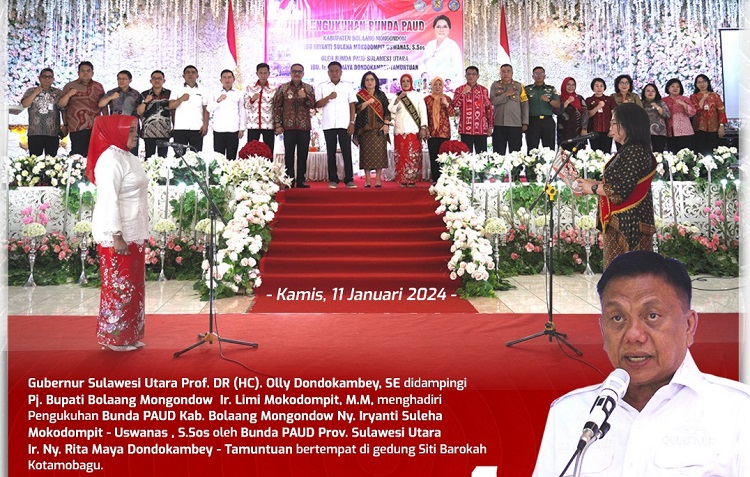 mediatotabuan.co, Bolmong – Penjabat (Pj) Bupati Bolaang Mongondow (Bolmong), Ir Limi Mokodompit MM, bersama Gubernur Sulawesi Utara (Sulut), Olly Dondokambey SE, menyaksikan Pengukuhan Bunda Pendidikan Anak Usia Dini (PAUD) Kabupaten Bolmong, Ny Iryanti Suleha Mokodompit Uswanas, Kamis (11/01/2024).