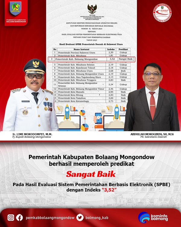 Pemkab Bolmong dinilai sukses dalam mewujudkan tata kelola pemerintahan yang bersih, efektiv, transparan dan akuntabel, serta pelayanan publik yang berkwalitas dan terpercaya melalui penerapan sistem pemerintahan berbasis elektronik pada instansi pusat dan instansi daerah pada tahun 2023.