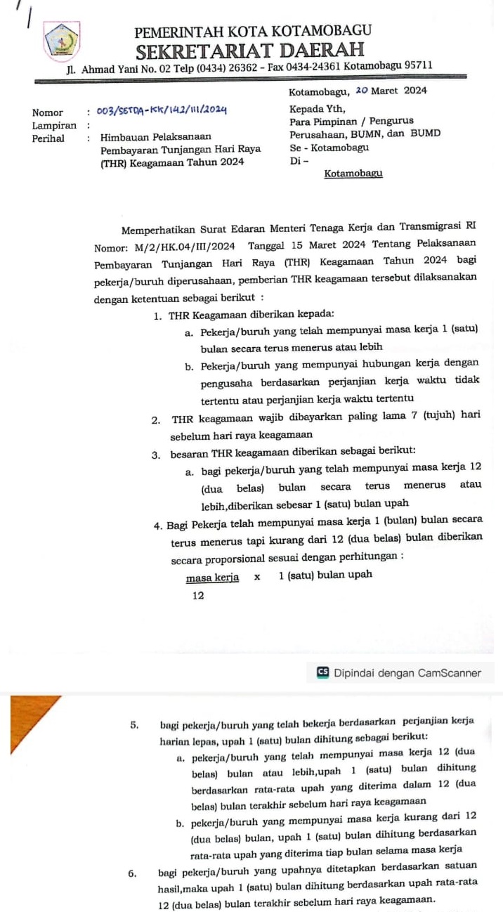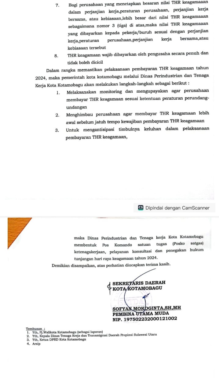 Kepala Dinas Perindustrian dan Tenaga Kerja (Disperinaker) Kota Kotamobagu, Johan Sofyan Boulu SE MM, ketika dikonfinrasi, membenrakan adanya surat edaran dari Pemkot Kotamobagu terkait pembayaran THR Keagamaan Tahun 2024 tersebut.