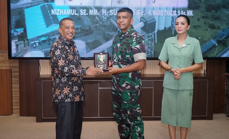 MEDIATOTABUAN, ASAHAN – Asisten Pemerintahan dan Kesejahteraan Rakyat Buwono menyerahkan plakat Kepada Komandan Korem (Danrem) 022/Pantai Timur di aula Kodim 0208/AS, Rabu (24/4/2024).