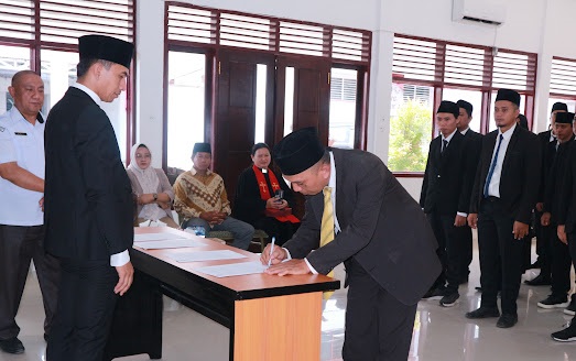 Penandatanganan dokumen pelantikan dan pengambilan sumpah kepada PPK se-Kota Kotamobagu dihadapat Ketua KPU Kotamobagu Mishart A. Manoppo. (Foto: Humas KPU Kotamobagu)