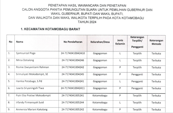 Selengkapnya, daftar nama-nama PPS Pilkada 2024 di Kota Kotamobagu yang dilantik: