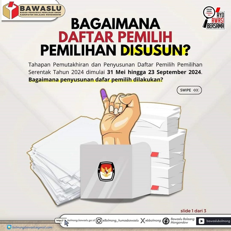 MEDIATOTABUAN, BOLMONG – Badan Pengawas Pemilihan Umum (Bawaslu) Kabupaten Bolaang Mongondow, kembali mengingatkan beberapa poin imbauan selama proses pencocok dan penelitian berjalan, mulai 24 Juni hingga 25 Juli 2024.