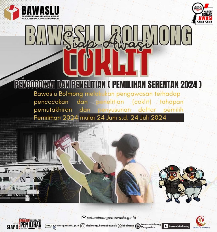MEDIATOTABUAN, BOLMONG – Badan Pengawas Pemilihan Umum (Bawaslu) Kabupaten Bolaang Mongondow, kembali mengingatkan beberapa poin imbauan selama proses pencocok dan penelitian berjalan, mulai 24 Juni hingga 25 Juli 2024.