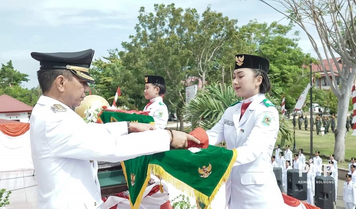 Pj Bupati Bolmong, dr Jusnan Mokoginta, saat menyerahkan Bendera Merah Putih kepada anggota Paskibraka Bolmong, untuk dikibarkan dalam Upacara HUT Kemerdekaan RI di Bolmong. (Foto: Diskominfo Bolmong)