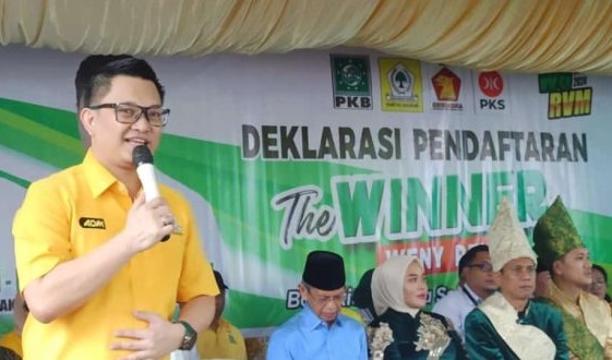ADM yang menggunakan kameja kuning tampil dalam orasi dihadapan ribuan pendukung Winner menyampaikan alasan memilih pasangan muda tersebut.