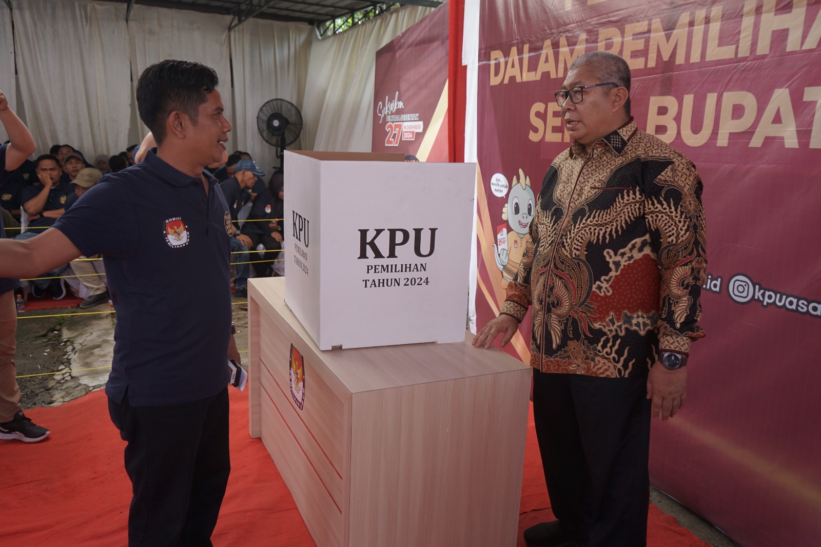 MEDIATOTABUAN.CO – ASAHAN – Menjelang pemungutan suara Pilkada Serentak tanggal 27 November 2024, Komisi Pemilihan Umum (KPU) Kabupaten Asahan menggelar Simulasi Pemungutan dan Penghitungan Suara di Halaman Kantor KPU Kabupaten Asahan Jalan Sisingamaharaja Kisaran, Minggu (17/11/2024). Simulasi turut dihadiri Pj Sekretaris Daerah Kabupaten Asahan, mewakili Kapolres Asahan, Ketua KPU Kabupaten Asahan beserta jajaran dan tamu undangan lainnya.