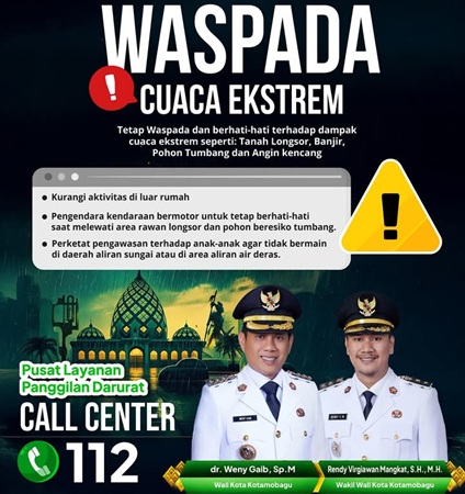 Pemerintah Kotamobagu juga mengajak seluruh masyarakat untuk selalu mengikuti perkembangan informasi cuaca dari sumber resmi dan segera melaporkan kepada pihak berwenang jika menemukan kondisi yang berpotensi membahayakan.