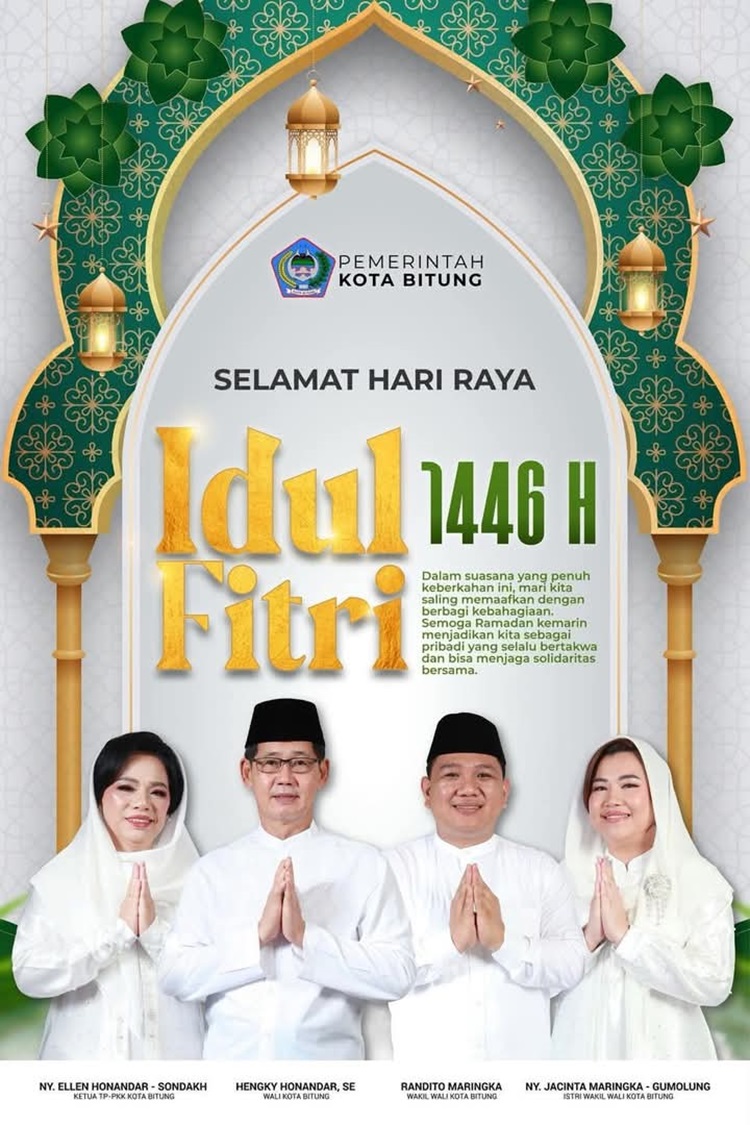 “Atas nama pribadi, keluarga, dan Pemerintah Kota Bitung, kami mengucapkan selamat hari raya Idul Fitri 1446 Hijriah, minal ‘aidin wal faidzin, mohon maaf lahir dan batin. Semoga Tuhan Yang Maha Kuasa, senantiasa melimpahkan berkah, kedamaian, dan kebahagiaan bagi kita semua,” tutupnya.