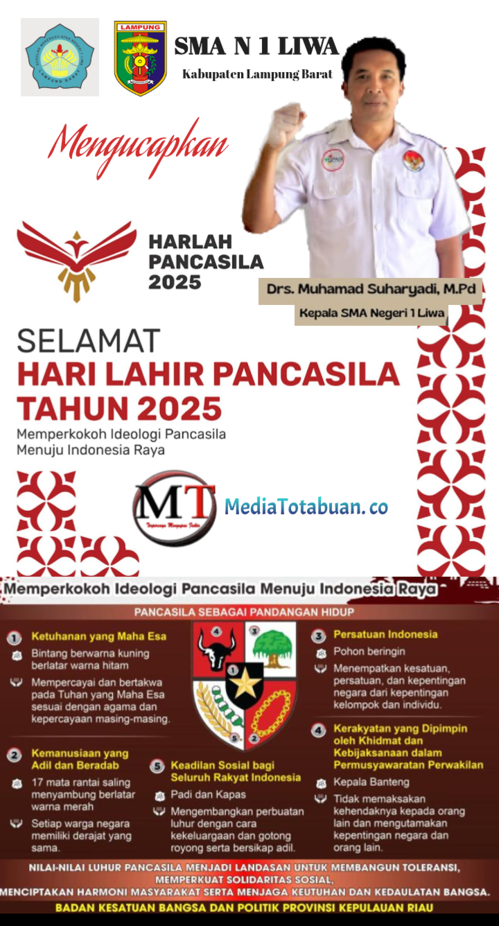 SMAN 1 LIWA Mengucapkan Selamat Hari Lahir Pancasila 1 Juni 2025Admin03/06/2025Uncategorized Selamat Hari Lahir Pancasila 1 Juni 2025 Jangan LewatkanRSUD ALIMUDDIN UMAR MENGUCAPKAN MINAL AIDZIN WALFAIDZIN MOHON MAAF LAHIR DAN BATHINPemkab Lampung Barat Terbitkan Surat Edaran BHR untuk Driver Online dan THR bagi Pekerja 2026Pemkab Lampung Barat Gelar Pra-Musrenbang Tematik Stunting Tahun 2026Penanaman Jagung Serentak Kuartal I 2026, Pemkab Lampung Barat Perkuat Ketahanan Pangan