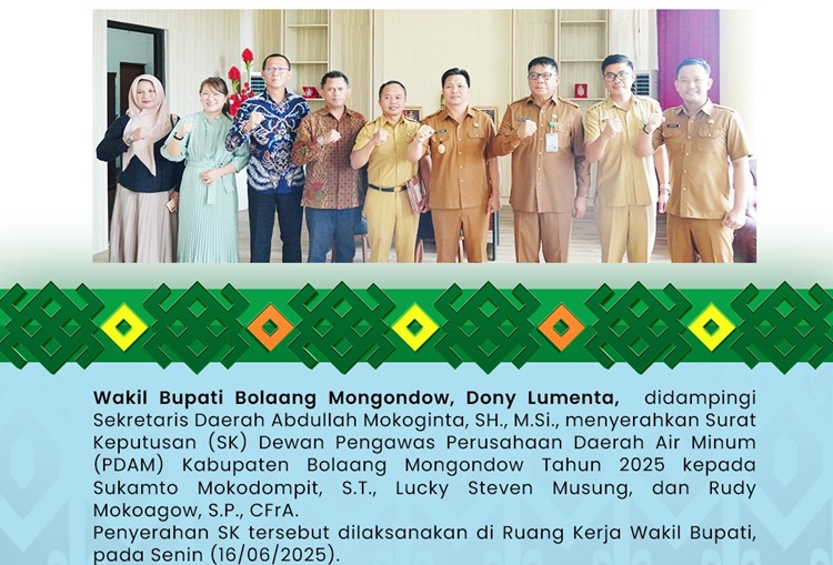 Bolmong – Ketiga personil Dewan Pangawas (Dewas) Perusahaan Daerah Air Minum (PDAM) Kabupaten Bolaang Mongondow (Bolmong) Tahun 2025, resmi menerima SK Bupati Bolmong, Senin (16/06/2025).