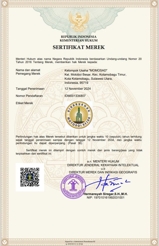 “Alhamdulillah, Binarundak sudah menjadi Hak Paten Kelurahan Moroboi Besar yang sudah berlogo diakui secara Nasional dan disahkan oleh Kementerian Hukum RI,” ucap Tendi Ponubu.