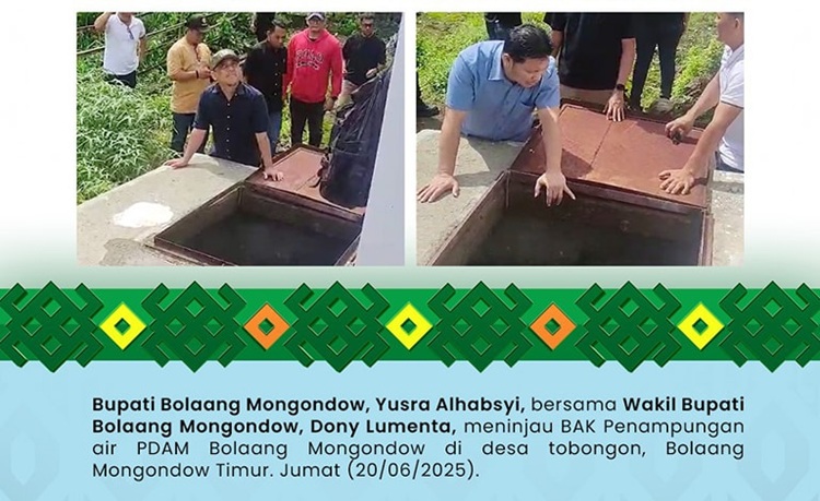 Bolmong – Bupati dan Wakil Bupati Bolaang Mongondow (Bolmong), Yusra Alhabsyi dan Dony Lumenta, meninjau Bak Penampuangan Air milik Perusahaan Daerah Air Minum (PDAM) Bolmong, di Desa Tobongon, Kecamatan Modayag, Kebupaten Bolmong Timur, Jumat (20/06/2025).
