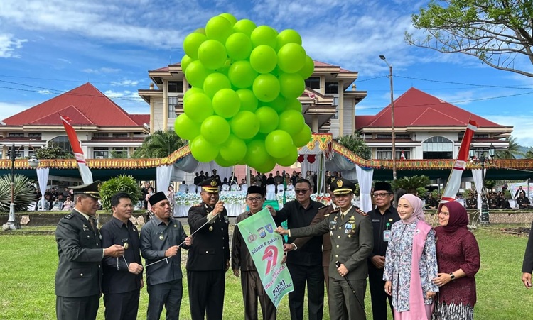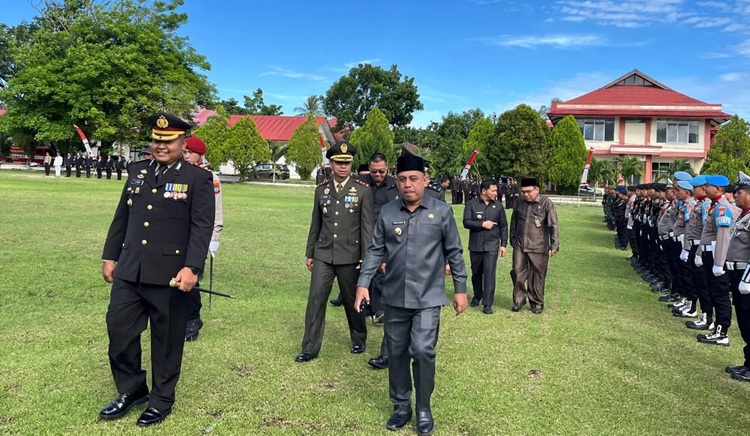 Bupati Bolmong didampingi Kapolres Bolmong dan Forkopimda Bolmong, saat memeriksa barisan upacara dalam rangka HUT Bhayangkara ke-79 Tahun 2025. (Foto: Diskominfo Bolmong)