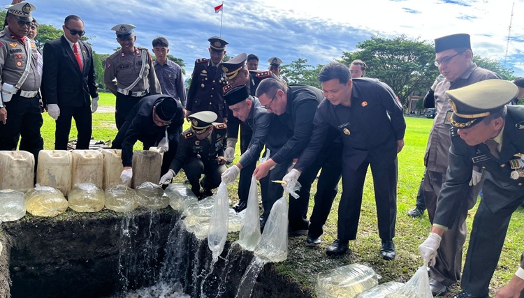 Usai upacara, Bupati Yusra dan Wabup Dony bersama Kapolres Bolmong, Ketua DPRD Bolmong, Kepala Pengadilan Negeri Kotamobagu, perwakilan Kejaksaan Negeri, perwakilan Dandim 1303, serta Komandan Yonarmed, dan Sekertaris Daerah, melakukan pemusnahan barang bukti hasil sitaan Polres Bolmong.
