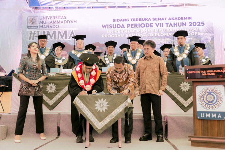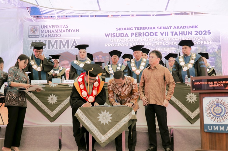 Penandatanganan MoU tersebut dilaksanakan dalam rangkaian Wisuda Periode VII Tahun 2025, Program Sarjana, Diploma, dan Profesi, Universitas Muhammadiyah Manado, oleh Wali Kota Kotamobagu, dr. Weny Gaib, Sp.M, dan Rektor UMM Prof. Dr. Nazaruddin Malik, S.E., M.Si.