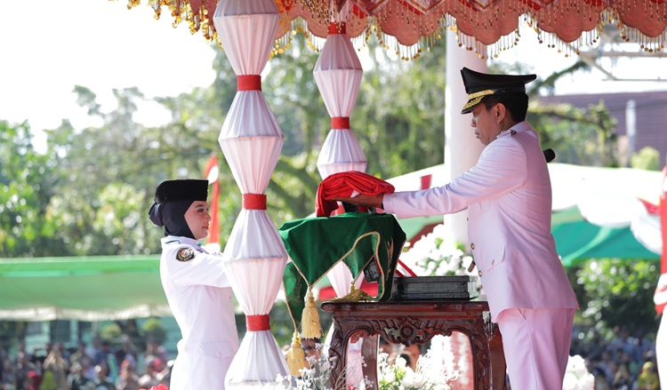 Upacara berlangsung khidmat tersebut, dilaksanakan pengibaran bendera merah putih oleh Paskibraka Kota Kotamobagu.