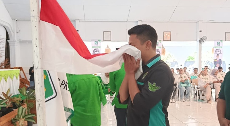 Salah satu kader DPC PKB Kotamobagu dan Garda Bangsa, saat mencium bendera Merah Putih dan bendera PKB usai menyatakan sikap siap mengabdi ke PKB. (Foto: Gito Simbala)
