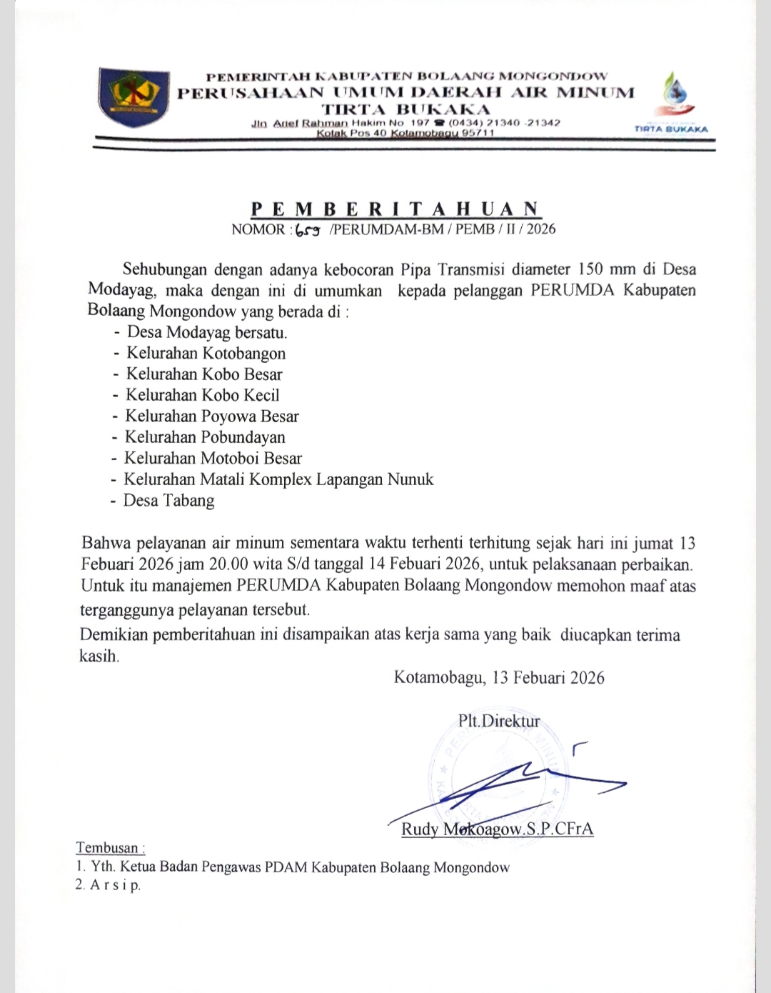“Bahwa pelanggan air minum sementara waktu terhenti sejak hari ini, Jumat 13 Februari 2026, jam 20.00 wita, sampai dengan tanggal Sabtu 14 Februari 2026 karena sedang mengalami perbaikan,” kata Rudy Mokoagow.