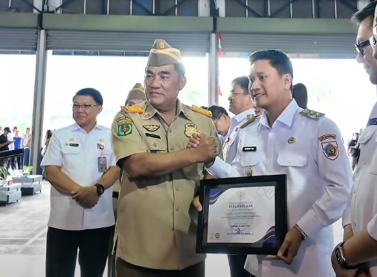 Rendy Mangkat, menerima penghargaan yang diberikan kepada Wali Kota Kotamobagu Weny Gaib atas keberhasilan dalam pembinaan Program K3 di wilayahnya.