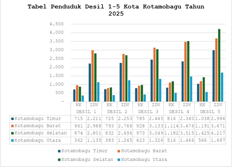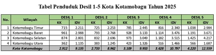Secara keseluruhan di Kota Kotamobagu, jumlah Desil 1 mencapai 2.912 KK atau 9.135 jiwa sebagai kelompok sangat miskin.