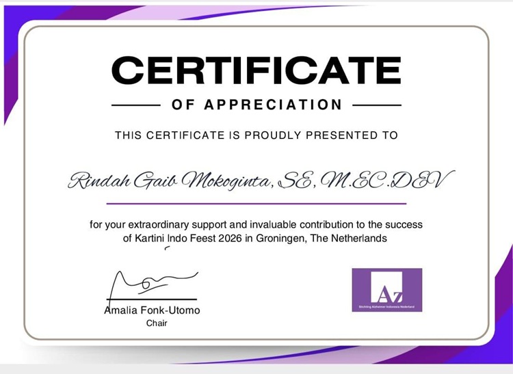 Dalam sertifikat yang tersebar luas itu, bertuliskan sertifikat ini dengan bangga dipersembahkan kepada nama Rindah Gaib Mokoginta SE MEc Dev.