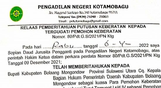 Pemkab Bolmong Terima Putusan PN Kotamobagu Perkara Keberatan Berita, BERITA UTAMA, BOLMONG, DAERAH, HUKRIM, Pemerintahan, Sulawesi Utara|06/04/202206/04/2022by Administrator mediatotabuan.co, Bolmong – Pemerintah Kabupaten (Pemkab) Bolaang Mongondow (Bolmong), melalui Bagian Hukum,