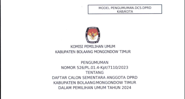 KPU Boltim Umumkan Daftar Calon Sementara Anggota DPRD Kabupaten Pemilu 2024 Berita, BERITA UTAMA, BOLTIM, DAERAH, POLITIK|23/08/202323/08/2023by Administrator Bahwa untuk melaksanakan ketentuan Pasal 70 Peraturan KPU Nomor 10 Tahun 2023