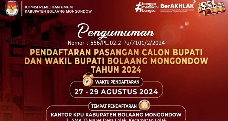 KPU Bolmong Umumkan Pendaftaran Bakal Paslon Bupati dan Wakil Bupati Berita, BERITA UTAMA, BOLMONG, DAERAH, POLITIK|26/08/202409/12/2024by Admin MEDIATOTABUAN, BOLMONG – Komisi Pemilihan Umum (KPU) Kabupaten Bolaang Mongondow (Bolmong), resmi