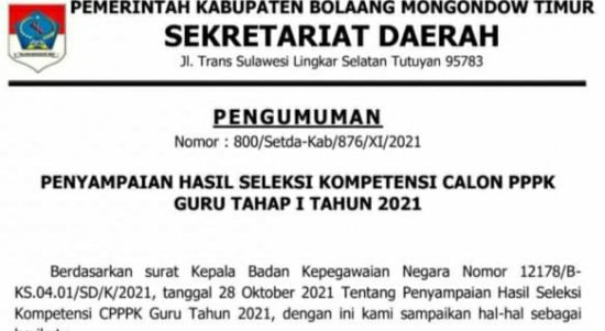 Ini Hasil Ujian Kompetensi PPPK Boltim 2021 Berita, BERITA UTAMA, BOLTIM, DAERAH, Nasional, Pemerintahan, Sulawesi Utara|17/11/202123/11/2021by Administrator mediatotabuan.co, Boltim – Panitia Seleksi (Pansel) Nasional Pengadaan Calon Aparatur Sipil Negara