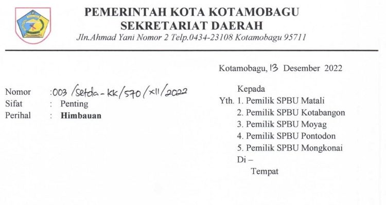 Pemkot Kotamobagu Terbitkan Surat Imbauan Terkait Penyaluran Jenis BBM Tertentu Berita, BERITA UTAMA, DAERAH, KOTAMOBAGU, Pemerintahan|14/12/202215/12/2022by Administrator mediatotabuan.co, Kotamobagu – Pemerintah Kota (Pemkot) Kotamobagu, menerbitkan surat imbauan Bernomor 003/Setda-KK/570/XII/2022