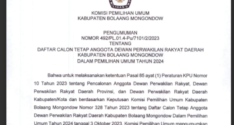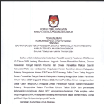KPU Bolmong Umumkan Daftar Calon Tetap Anggota DPRD Kabupaten Bolaang Mongondow Pemilu 2024 Uncategorized|04/11/202304/11/2023by Administrator Bahwa untuk melaksanakan ketentuan Pasal 70 Peraturan KPU Nomor 10 Tahun 2023