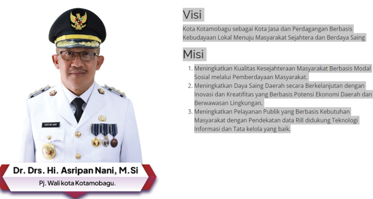 Ini Visi dan Misi Pemkot Kota Kotamobagu Berita, BERITA UTAMA, DAERAH, KOTAMOBAGU, Pemerintahan|22/04/202425/04/2024by Admin mediatotabuan.co, Kotamobagu – Pemerintah Kota (Pemkot) Kotamobagu, saat ini dipimpin Pejabat (Pj)
